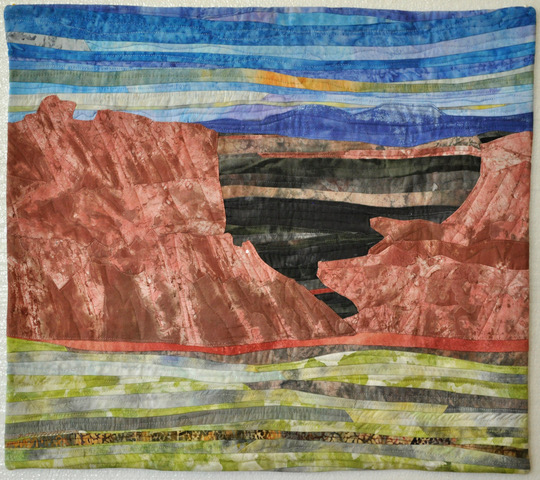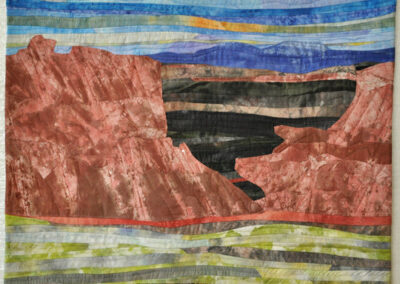 The Bears Ears National Monument has been surrounded by controversy for decades. This piece tries to capture the spirit of Bears Ears National Monument, especially, the rock formations. I created this piece in a Denise Labadie class. It was fun to create the fabric to use in this piece.