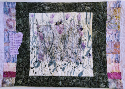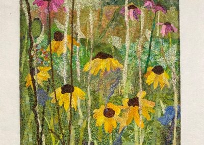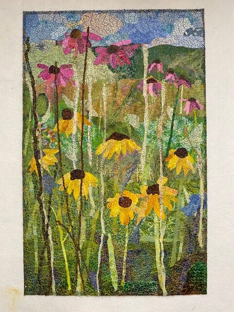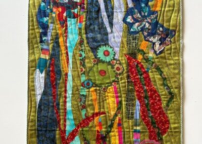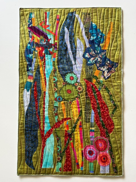 Methods/Materials: Commercial and hand-dyed fabric, velvet, batting, fusible web, yarn and variegated thread. Flowers and stems are created by loosely cutting fabric, fused, then crazy stitched.
