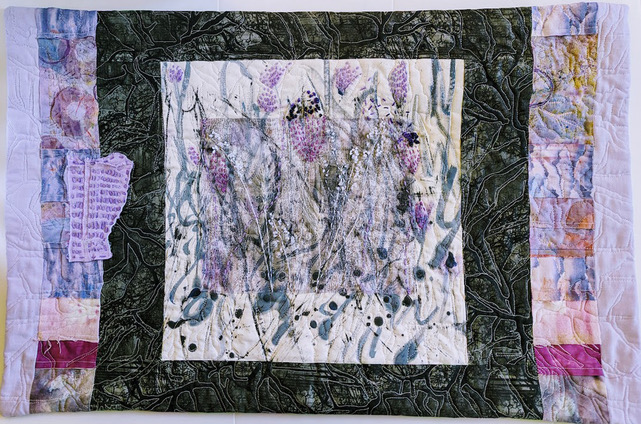 Methods/Materials: Commercial and hand-dyed fabric, stamps, acrylic paint, vinyl, and variegated thread. Fabric is painted with multiple tools and techniques, then the overall composition is monoprinted using vinyl and acrylic paint to create texture and movement.