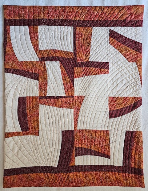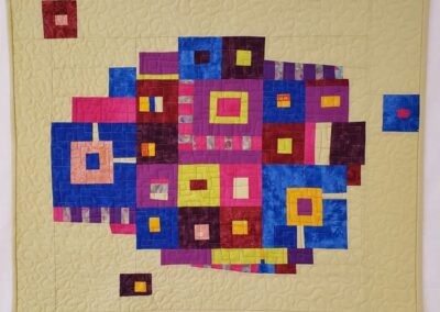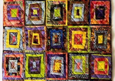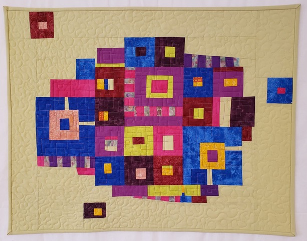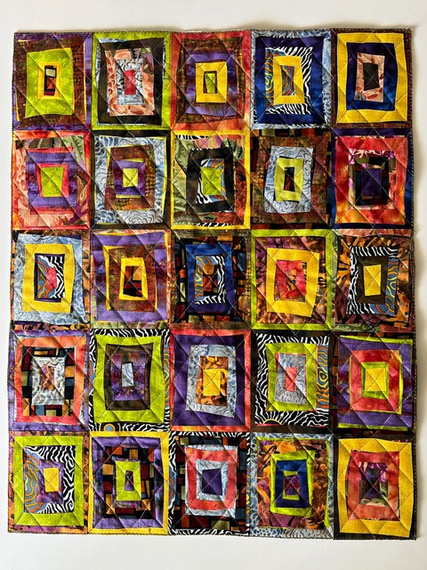 This quilt was begun in a Cindy Grisdela Zoom workshop on improv piecing in March of 2021. The striped sections were actually trimmings from another small quilt. Although they weren’t part of the workshop plan, I decided to use them in this improv log cabin design. I challenged myself to work with fabrics that I had in my scrap bin or stash and had fun “letting loose!”