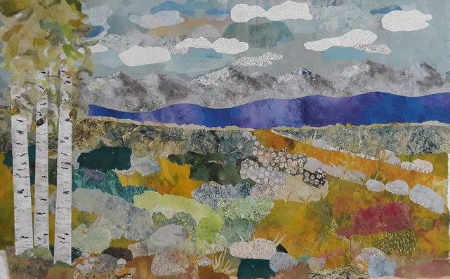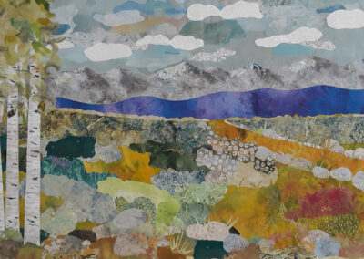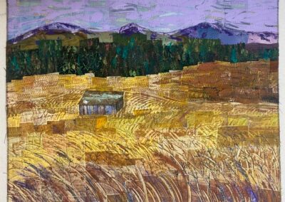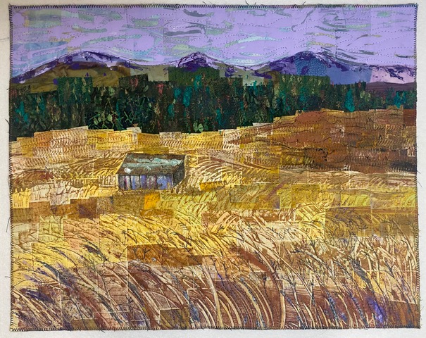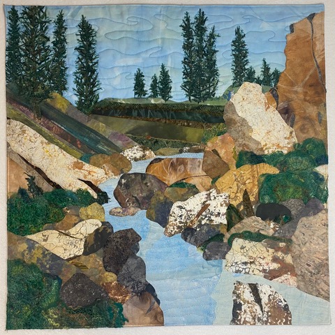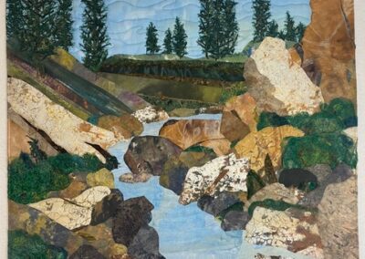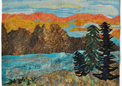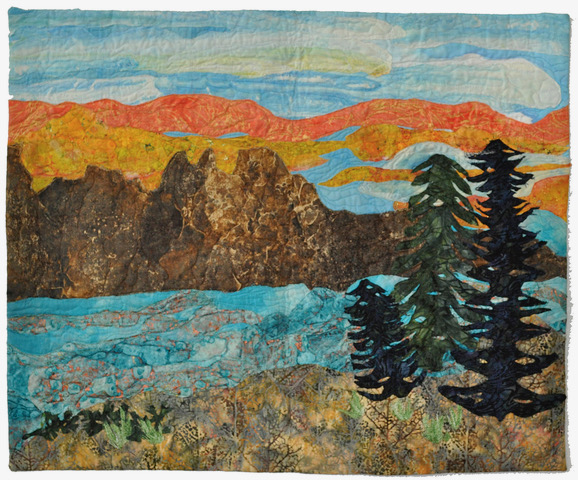 I was inspired to create this piece from the hand painted water and sky fabrics that I had previously made. I added mountains, trees, and a foreground that was inspired by photos of Colorado. I enjoy the outdoors and take many photos while outside. This piece was made in a Jean Herman class.