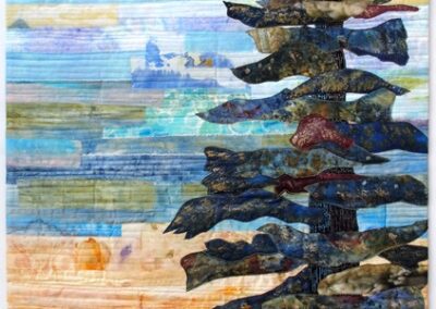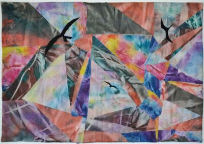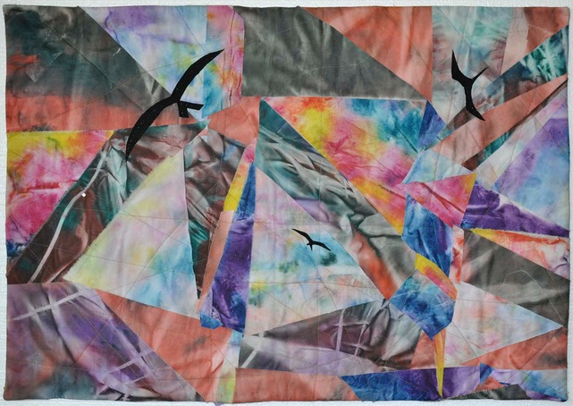 The only fabric I brought to a Patty Hawkins class was a set of hand painted fabrics created in a Denise Labadie class. The design came together gradually, coordinating the colors and the triangle shapes. Once done, it felt like a storm. The birds were appliqued on to help give context to the storm.