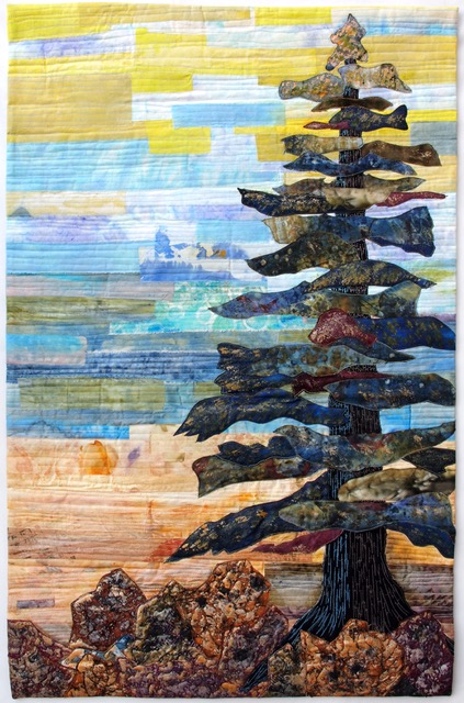 Methods/Materials: Materials include commercial and hand-dyed fabric, silk, yarns, tulle, fusible web, water soluble material and variegated thread. Fabric has been dyed, then treated with flour or glue, cracked, then dyed or paint goes over the top to create fabric the has cracks and/or veins throughout. Trees are created individually with tiny cut fabric, secured and stitched down with tulle.